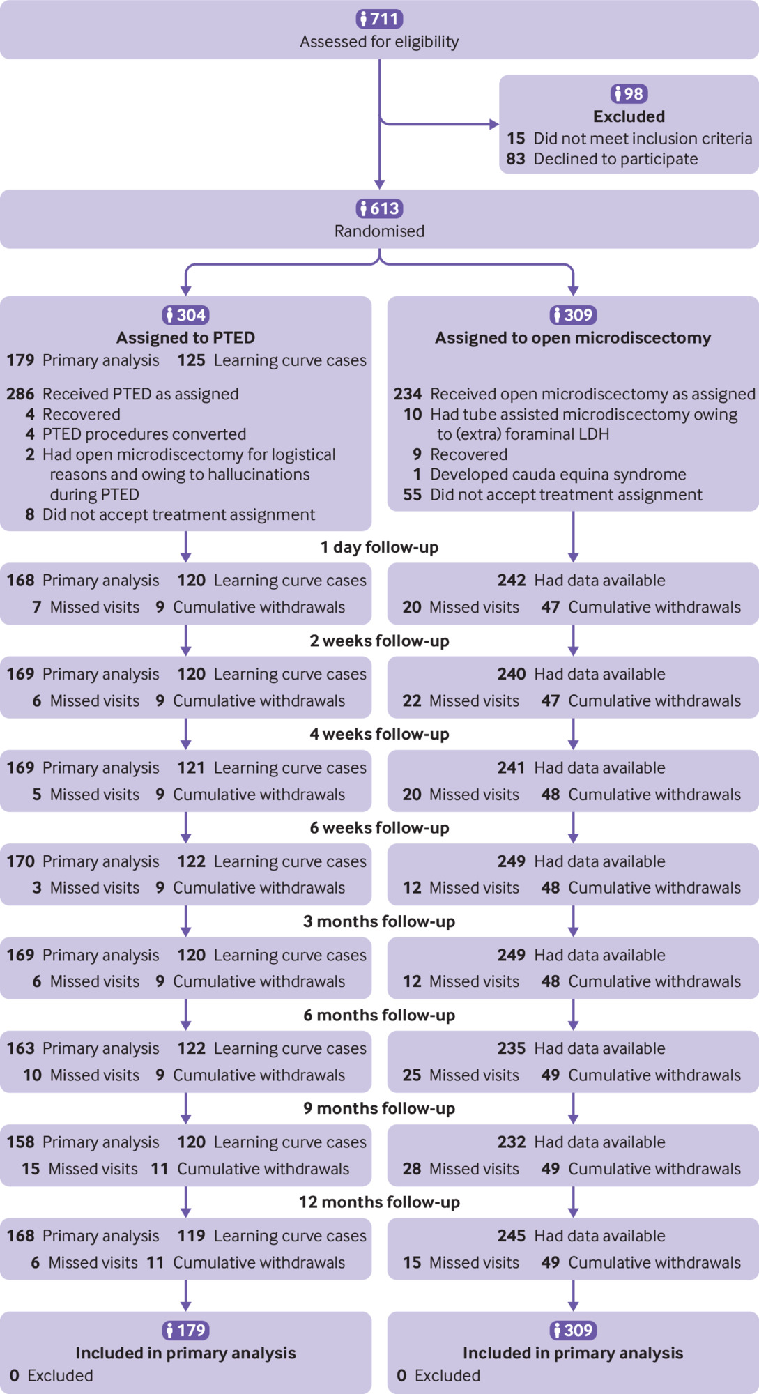 In the period between February 2016 and April 2019, 711 patients were assessed for eligibility, of whom 613 patients were enrolled into the PTED-study (fig 1). The baseline characteristics of the patients were similar in both groups (table 1). The trial was finalised before the estimated sample size of 682 participants was reached, because the end of the enrolment period of the study was reached. Of the 304 patients randomised to PTED, 286 (94%) received the intervention; of the 309 patients randomised to open microdiscectomy, 244 (79%) had microdiscectomy as assigned; 10 of these were tube assisted. At 12 months of follow-up, the primary outcome was available for 532 (87%) of the randomised patients.
